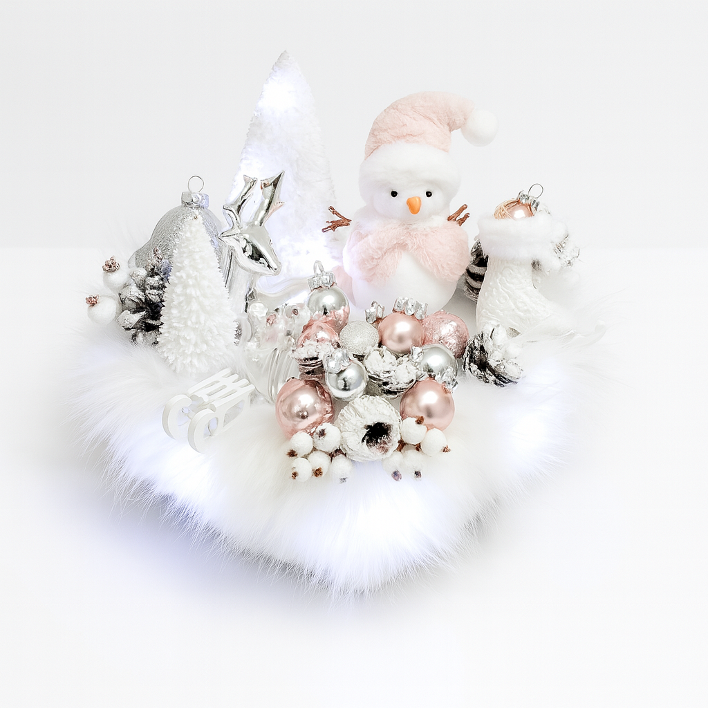 Globurile roz perlat, brăduții îmbrăcați în zăpadă, renii argintii și omul de zăpadă în tonuri pastel creează o scenă caldă și fermecătoare. Texturile pufoase și lumina difuză se împletesc într-un decor care inspiră liniște și bucurie, asemenea unei dimineți de iarnă perfectă.