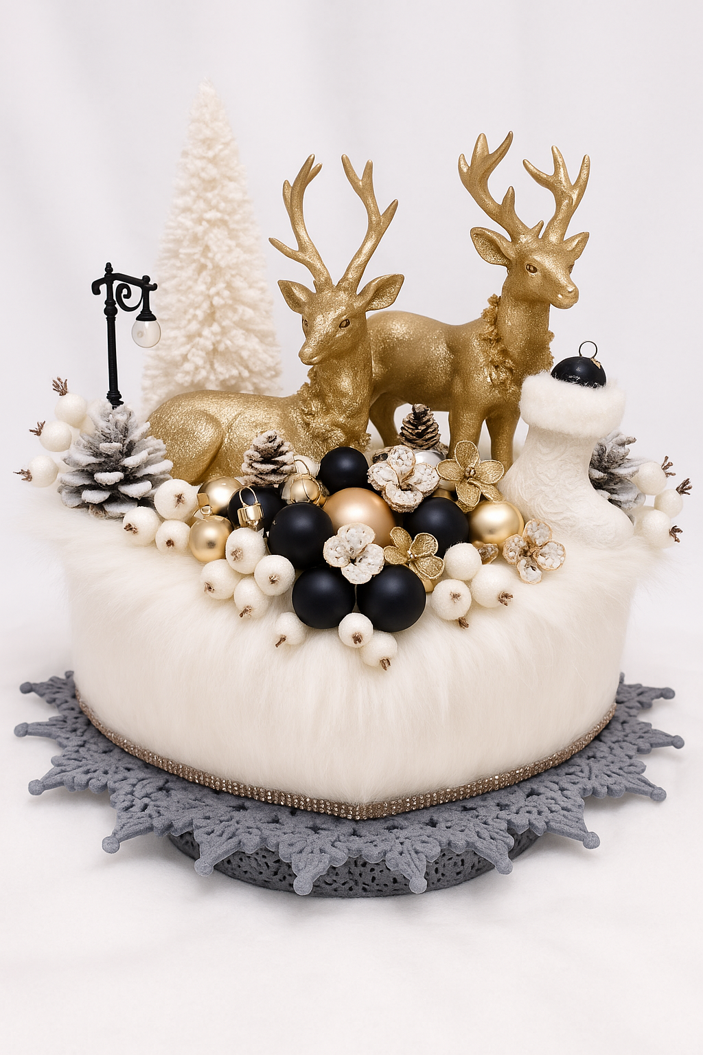 Două figurine de cerbi aurii tronează într-un peisaj de vis, înconjurați de globuri negre lucioase, accente aurii mate și sclipitoare, conuri ninse și flori de bumbac. Totul este așezat pe un pat de blană albă moale, susținut de o cutie rotundă îmbrăcată în catifea crem și decorată cu o bordură de cristale — un simbol al luxului subtil și bunului gust.